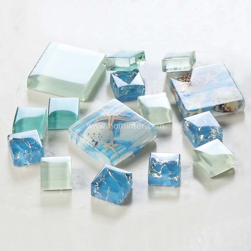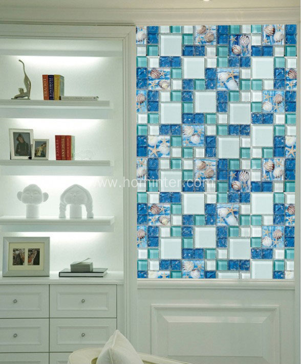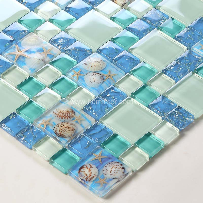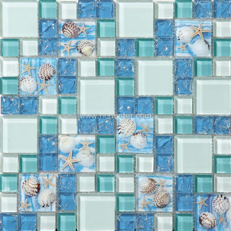 This tile is called glass conch tiles which are made of crystal glass chips with conch and crackle glass. The tile thickness is 8 mm and chip size is 23x23 mm, 48x48 mm. The resin chips are randomly added into the tile. And the inner stuffs are also random. Unique crackled looking glass mosaic tiles and yet safe for applications such as backsplash and shower walls. This kind of mosaic is a new design which makes the tile lively. There are three main colors, ocean blue, white and sky blue. Combining with the sky, the sea, the sunshine and the beach, what a great art work! It is especially recommended for the bathtub, mirror wall, bathroom wall, countertops area decorative.