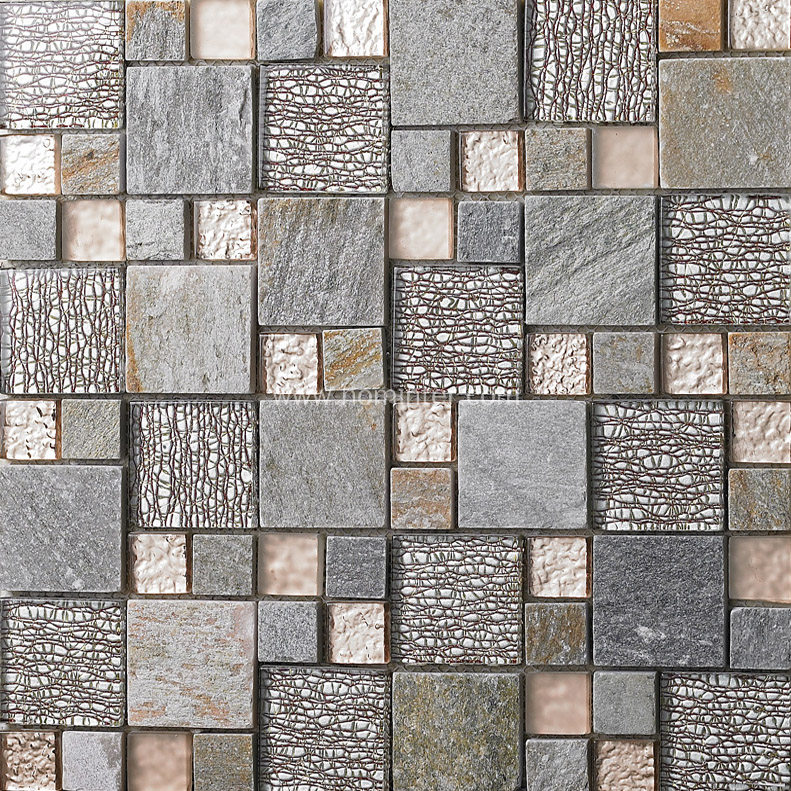 This tile was designed based on glass chips which have both finish: silver coated glass and clear crystal glass. When coating the glass chips, it makes the finish looks like metal, but it is stronger..