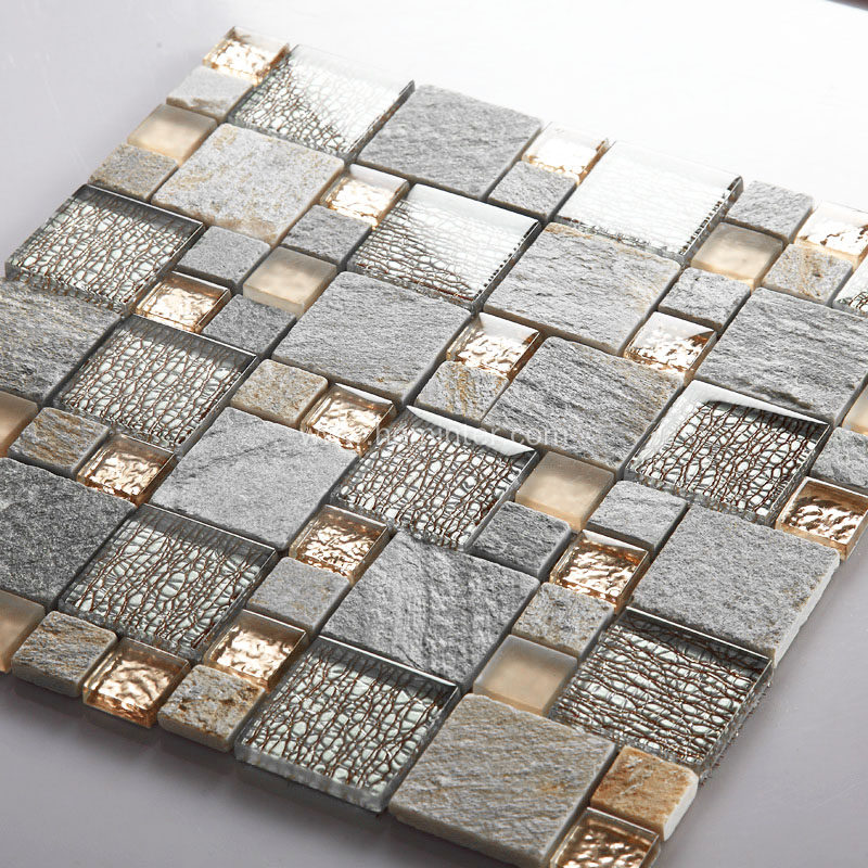 This mosaic has a gray stone with tones of silver rose gold glossy glass blended together on a mesh 12x12 sheet for easy installation. Perfect product for any kitchen backsplash or bathroom remodel. Update the look of your backsplash or shower wall with the glass and stone tile. The mix of materials in a contemporary color palette brings a touch of whimsy and fashion to your wall installation.