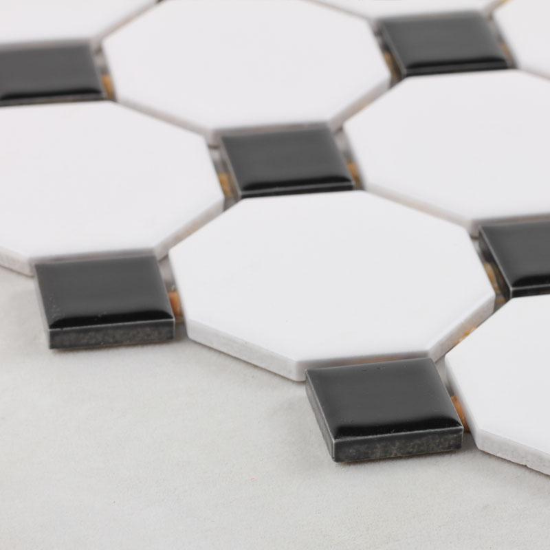Collection: Porcelain Mosaic Tiles; Material: Porcelain; Color: Black and White; Shape: Octagon and Square; Sheet Size: 295mmx295mm; Chip Size: 23x23mm, 56mm