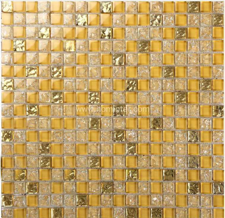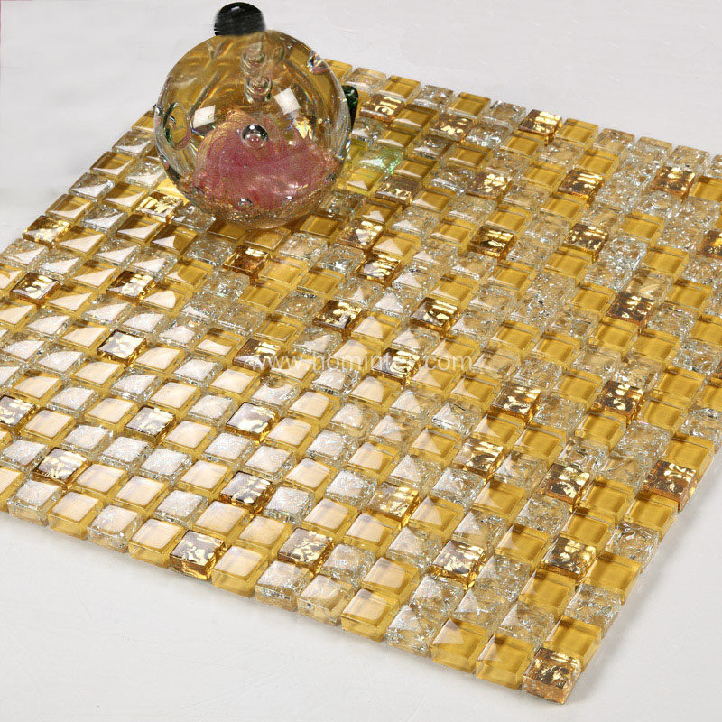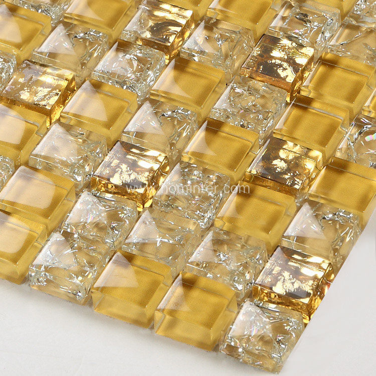 The gold glass backsplash tile mosaic is made of crackled glass without interfering with the surface's finish and therefore safe to use in applications such as kitchen backsplash, bathroom, and shower walls. The crackled glass tiles made of pure, clear glass is a solid piece but with its interior crackled, creating a contemporary look.