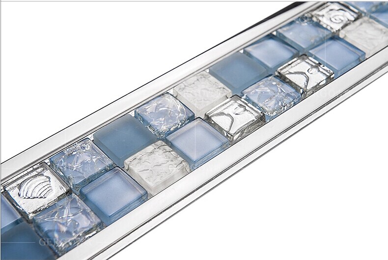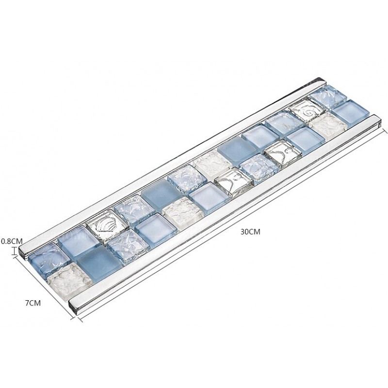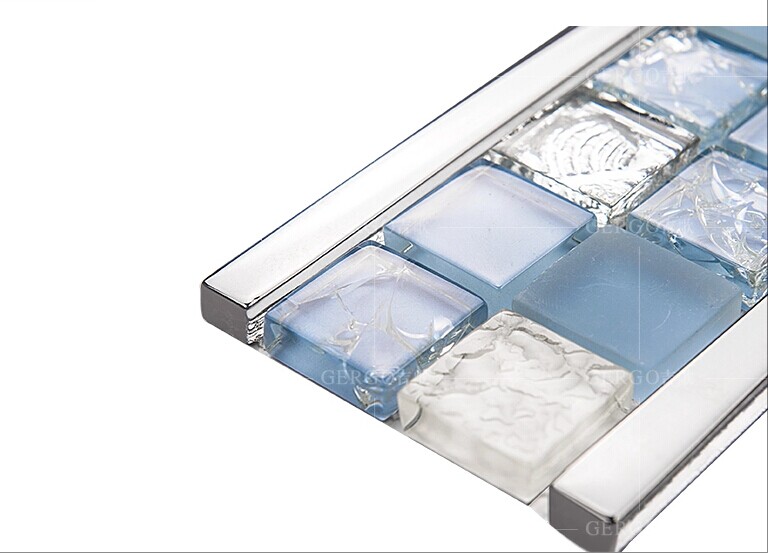 Collection: Metallic and Glass Mosaic Tiles; Material: Metal and Glass; Color: Silver and Blue; Shape: Strip; Size: 300mmx70mm; Thickness: 8mm