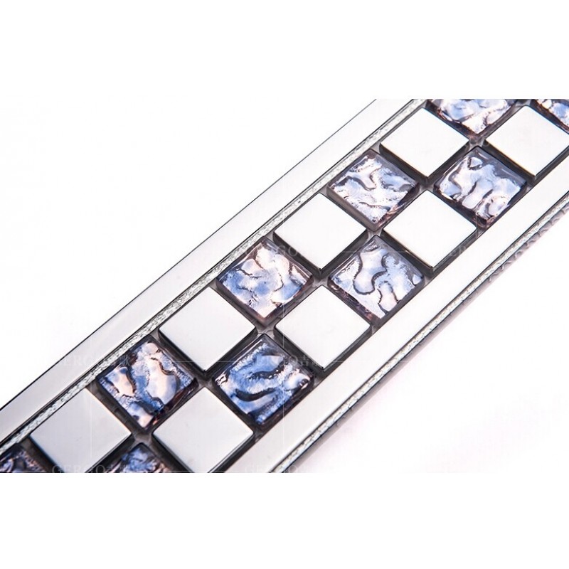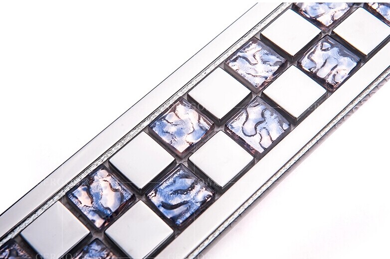 Collection: Metallic and Glass Mosaic Tiles; Material: Metal and Glass; Color: Silver and Blue; Shape: Strip; Size: 300mmx70mm; Thickness: 8mm