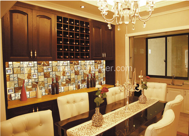 The gold glass mix metal tile for kitchen backsplash, bathroom, shower, featured walls, fireplace surround, countertop, Jacuzzis, and spas. This leaf pattern mosaic tile is made of crystal glass and it is mesh mounted on a 11.8" x 11.8" sheet for an easy installation.
