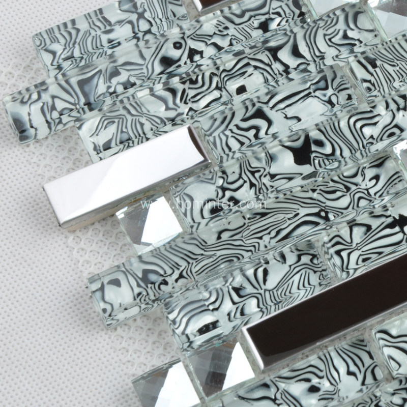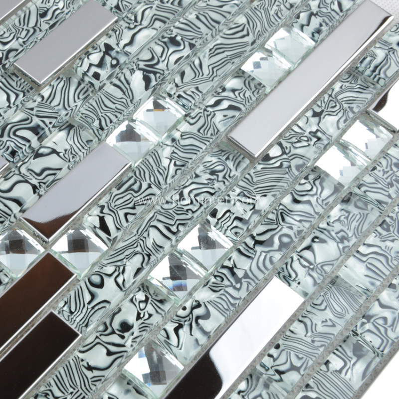 This tile was designed based on glass chips which have both finish: silver coated glass and clear crystal glass. When coating the glass chips, it makes the finish looks like metal, but it is stronger..