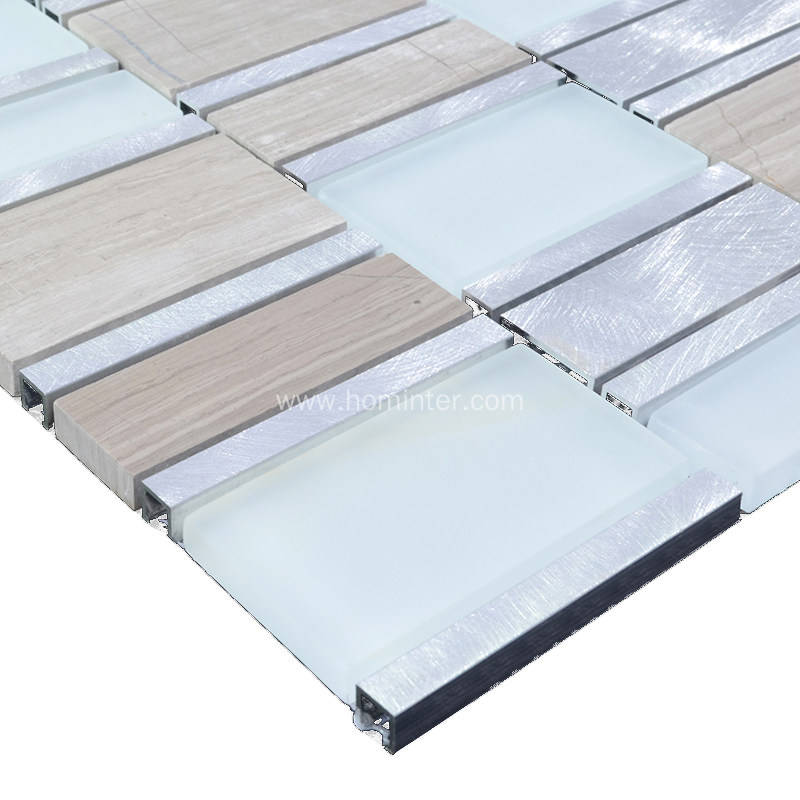 Composed from small glass, stone and aluminum alloy pieces, this polished, frosted and brushed mosaic tile serves as a stunning demonstration of modern day style and design within a stacked pattern. The mosaic tile has wide use for kitchen backsplash, fireplace deco, bathroom walls, shower walls, countertops, bath mirror deco, etc.