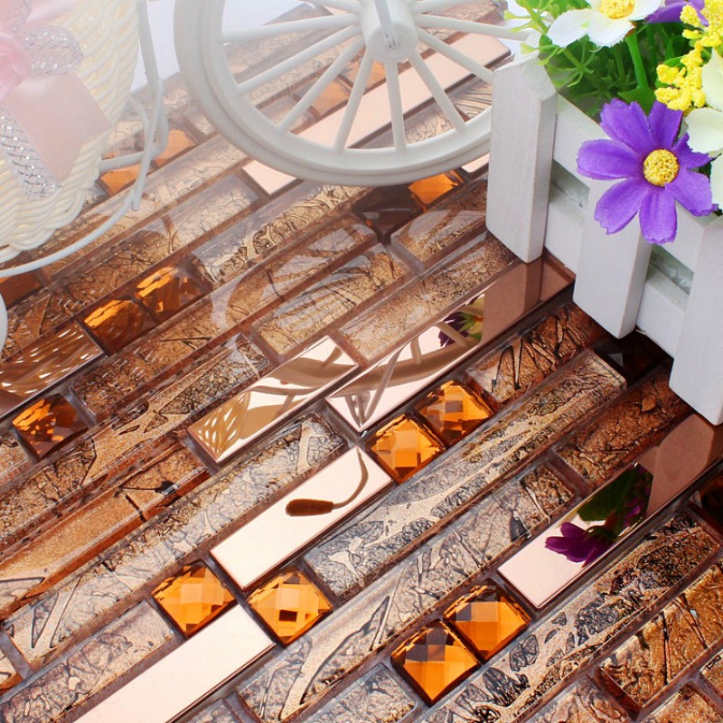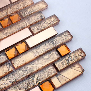 Collection: Metal Glass Mosaic Tiles; Material: Glass, Stainless Steel; Color: Champion; Shape: Strip and Square; Size: 300mmx300mm; Chip Size: 15mmx15mm, 15*48mm, 15*98mm; Thickness: 8mm