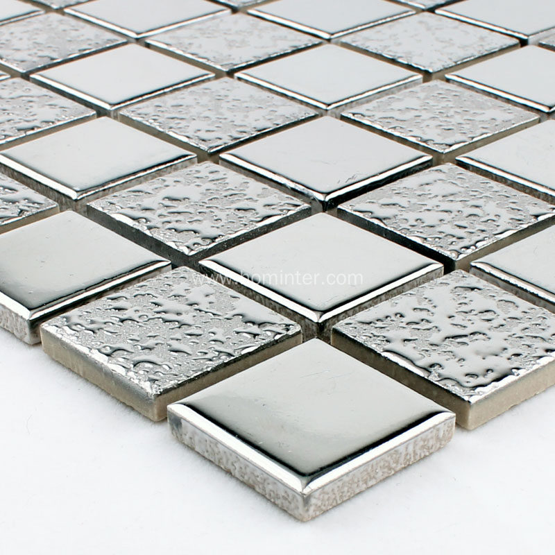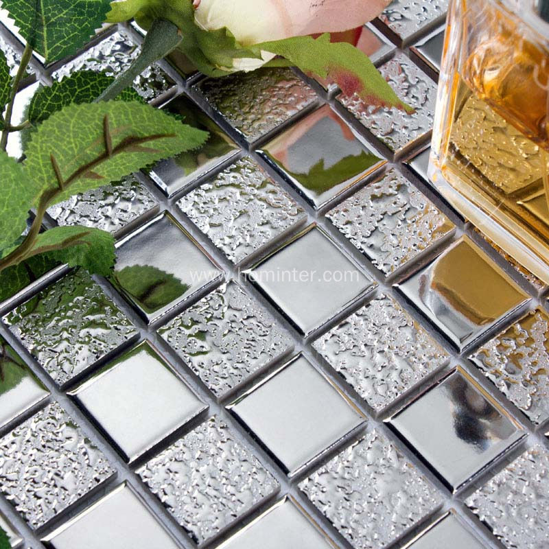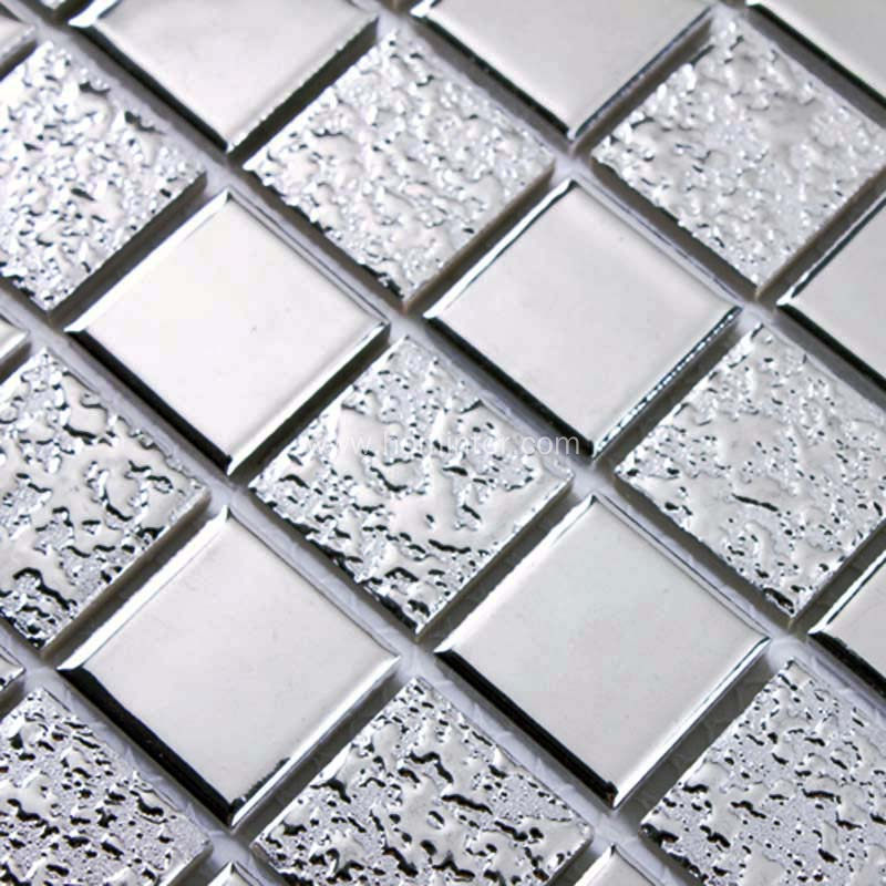 This tile was designed based on glass chips which have both finish: silver coated glass and clear crystal glass. When coating the glass chips, it makes the finish looks like metal, but it is stronger..