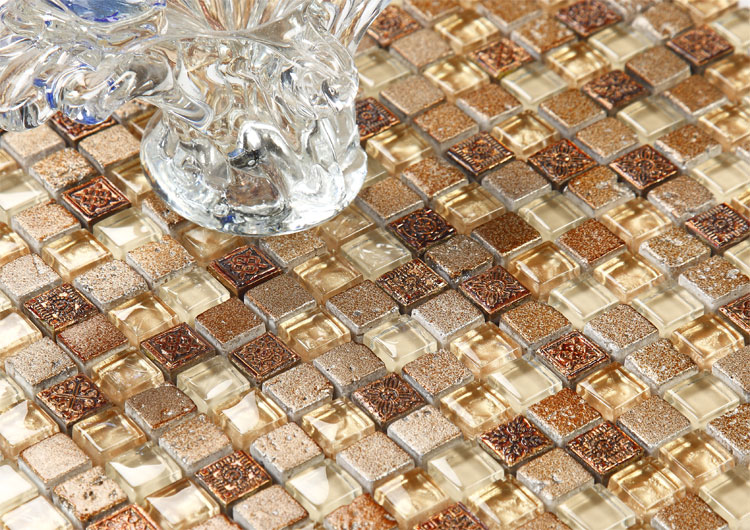 Collection: Stone Mosaic Tiles; Material: Stone and Glass; Color: Gold; Shape: Square; Size: 300mmx300mm; Chip size: 15x15mm; Thickness: 8mm