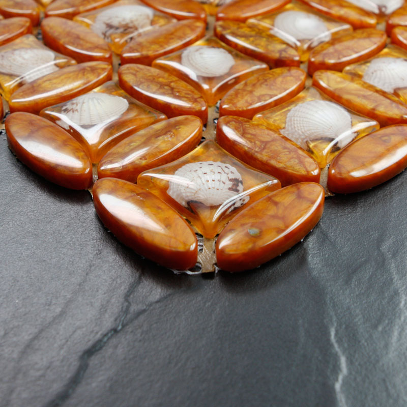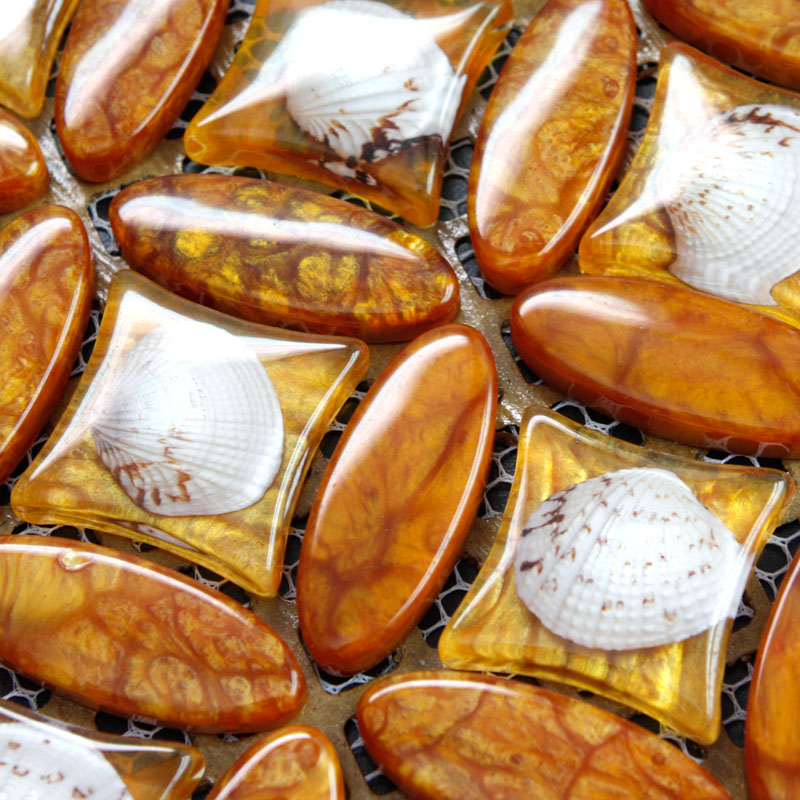 Collection: Glass Mosaic Tiles; Material: Glass and Shell; Shape: Irregular; Color: Red; Sheet Size: 300mmx300mm; Thickness: 6mm