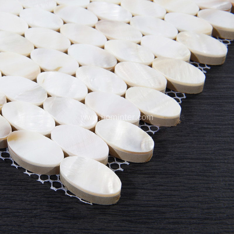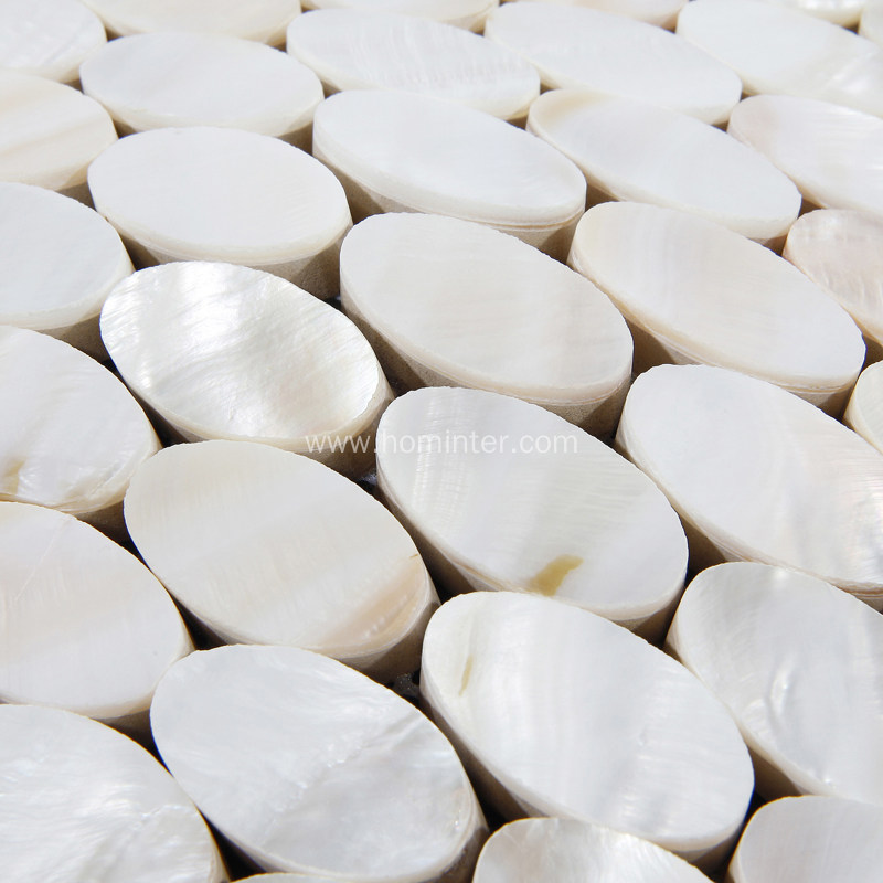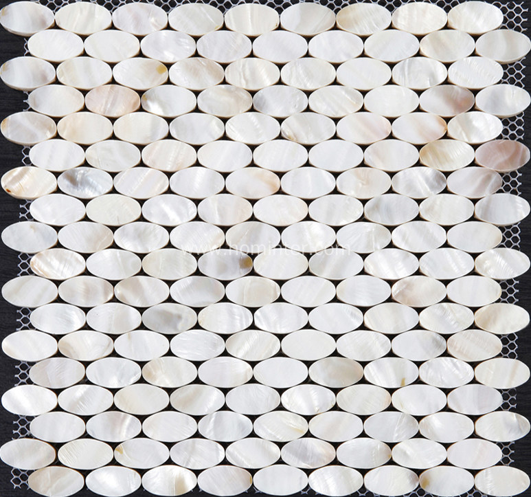 Collection: Mother of Pearl Tile with Porcelain Base; Material: Shell; Color Family: Natural White; Shape: Ellipse; Sheet Size: 12x12 In. (300x300mm); Chip Size: 0.7x1.3 In. (18x32mm); Thickness: 8mm