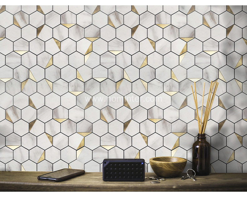 Premium Quality Peel and Stick Tile Hexagon White & Gold Adhesive Mosaic Wall Tiles. Resistant to humidity and heat. Quick and easy installation: No grout. Easy to clean and maintain. Perfect for accent walls, hallway walls, kitchen and bathroom backsplash, living room, bedroom, office walls decor.