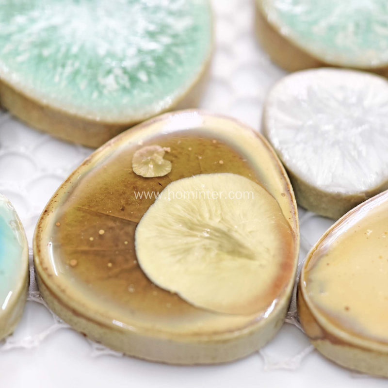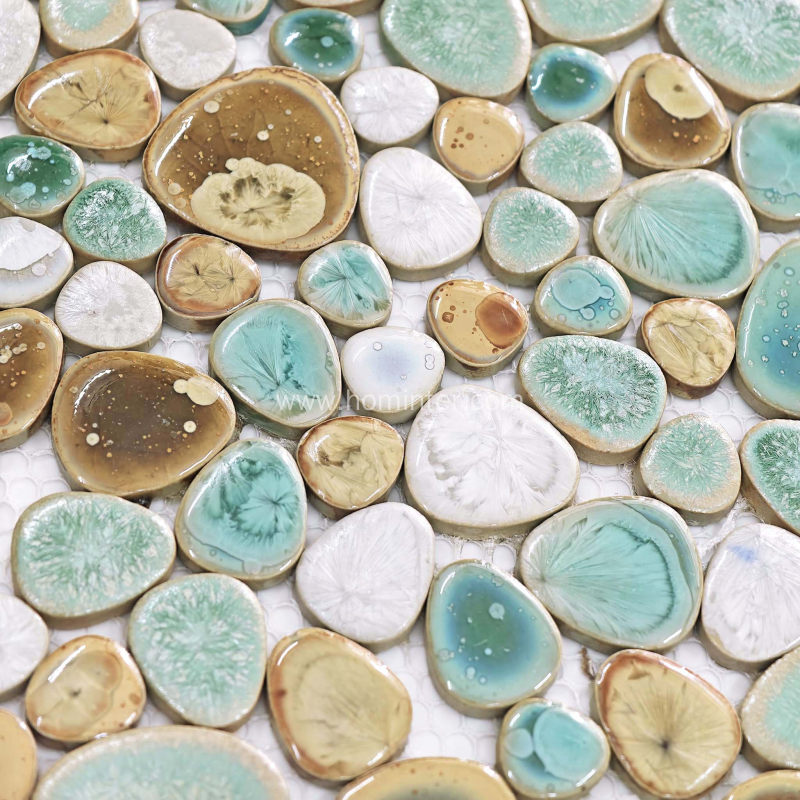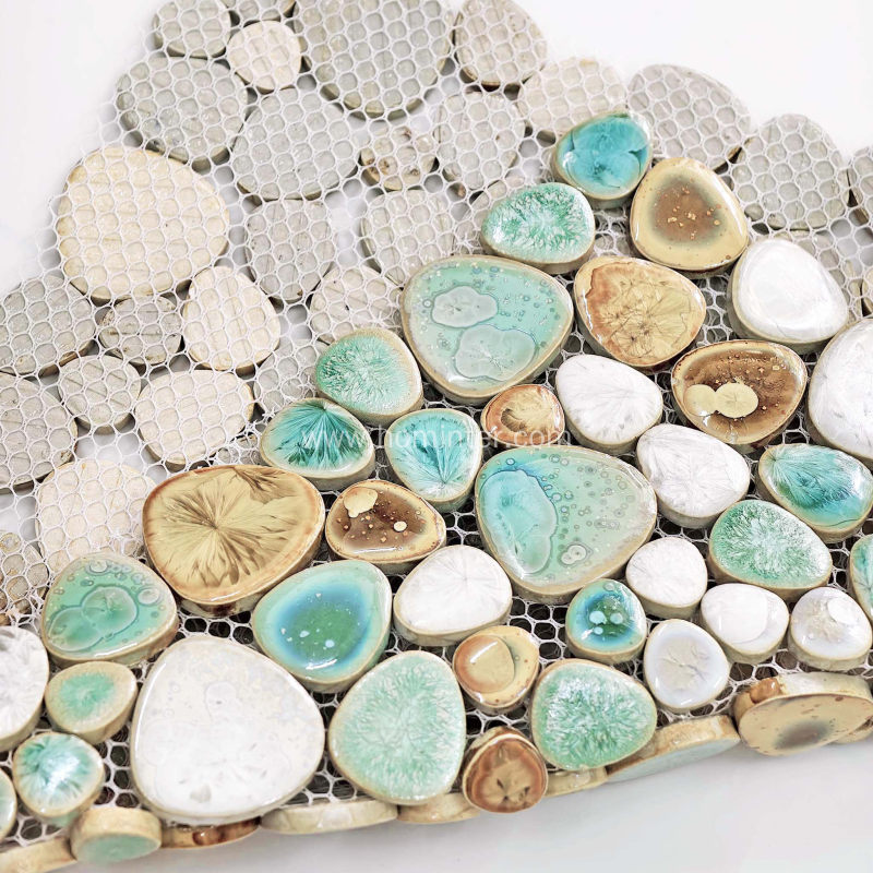 Porcelain pebble tiles are glazed porcelain tile which designed as pebble shapes. Porcelain tiles are waterproof and suited for indoor and outdoor areas with high traffic and moisture levels such as walls, commercial spaces and bathrooms. We create our Porcelain Pebble Tile Blue Brown White Glaze Smooth Mosaic by firing ceramic pebble shaped pieces in various sizes. The porcelain pieces are adhered to a durable mesh backing to make these mosaic floor tiles easy to install.