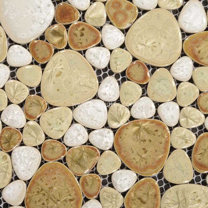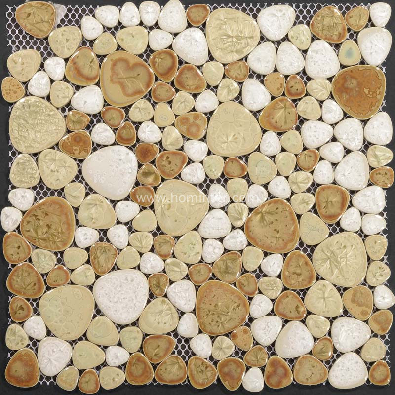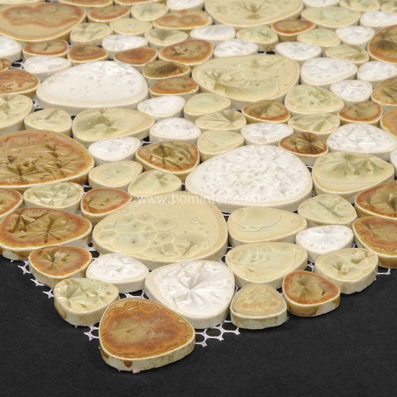 Porcelain pebbles are glazed porcelain tile which designed as pebble shapes. The chips look like triangles with rounded edges, also look like heart shape. These tiles are made of porcelain which almost has zero water absorption. Therefore, they are extremely good for swimming pools, bathroom and shower floor. The key point for production is the temperature. Only the right temperature can bring beautiful flambe effect that looks like flowers on the finish of the tile. These porcelain tiles are durable and stable. They may be used for both interior designs and outdoors.