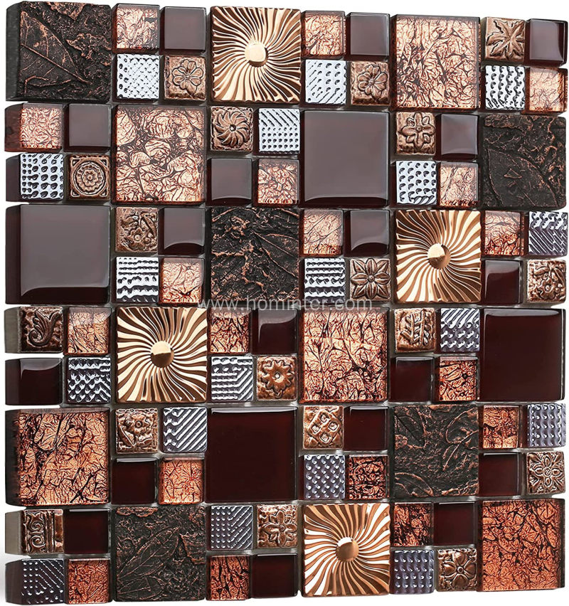Burgundy red wine colors glass tile 2" x 2" leaf carving imprints antique mosaics textured rose gold metal kitchen bathroom walls backsplash tiles. 70% crystal glass; 15% rose gold colors stainless steel; 15% Carving Imprints resin mosaics real tile. Great use for kitchen wall backsplash, bathroom wall backsplash, shower wall borders, bathtub areas, interior wall decoration. Mesh-mounted, easy for cutting. Scissors or a knife can easily cut the mesh. For cutting the glass, a wet saw is required.