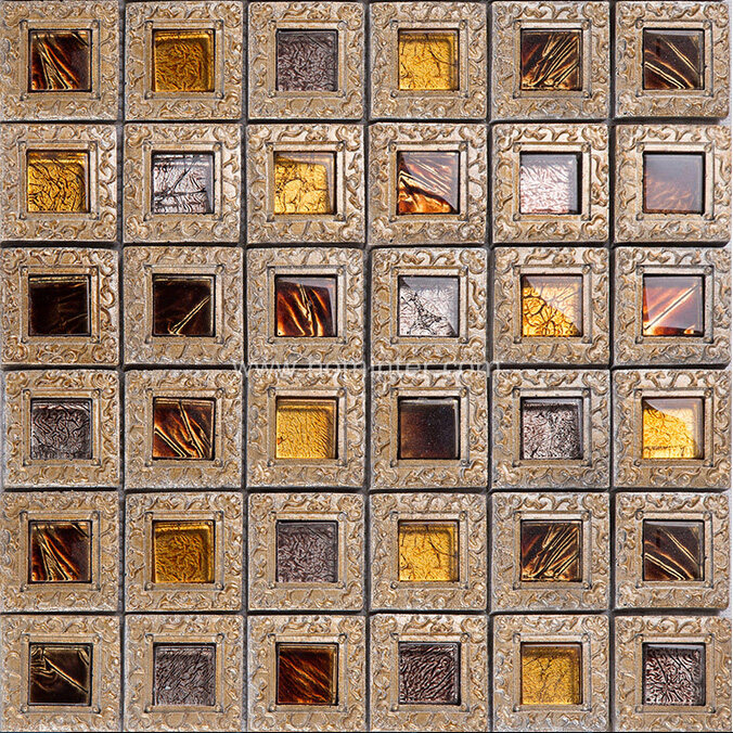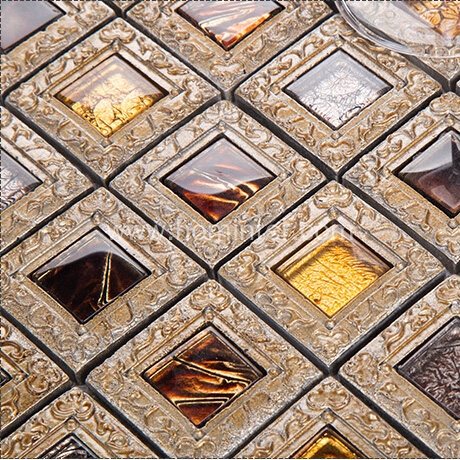 The gold glass mix metal tile for kitchen backsplash, bathroom, shower, featured walls, fireplace surround, countertop, Jacuzzis, and spas. This leaf pattern mosaic tile is made of crystal glass and i..