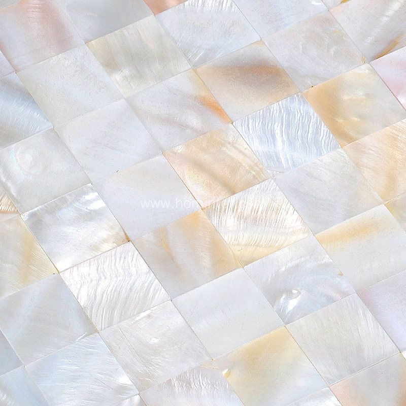 Collection: Mother of Pearl Tile; Material: Shell; Color: natural white, natural yellow; Shape: Square; Size: 300x300mm; Chip Size: 20x20mm; Thickness: 2mm