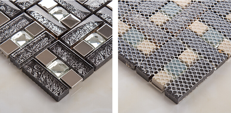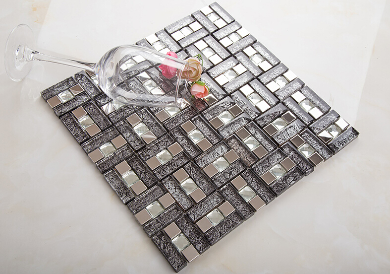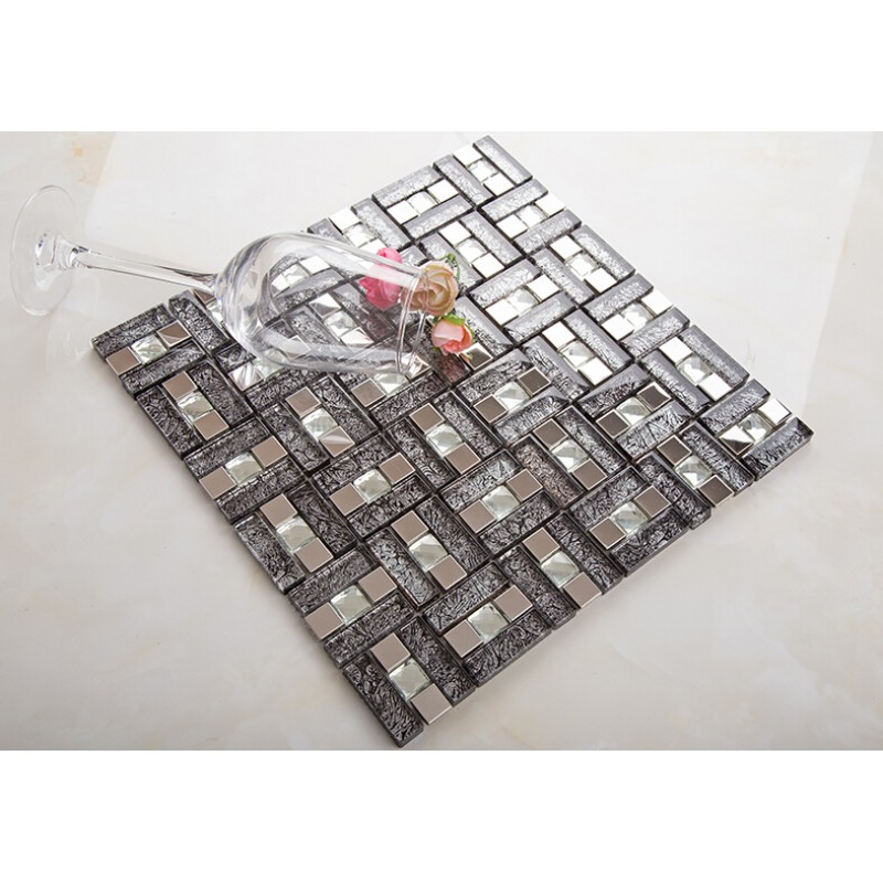 Collection: Metallic Mosaic Tiles; Material: Stainless steel,Glass; Color: Black and Silver; Shape: Square; Size: 300mmx300mm; Chip Size: 15x15mm,15x48mm; Thickness: 8mm