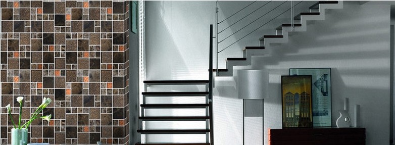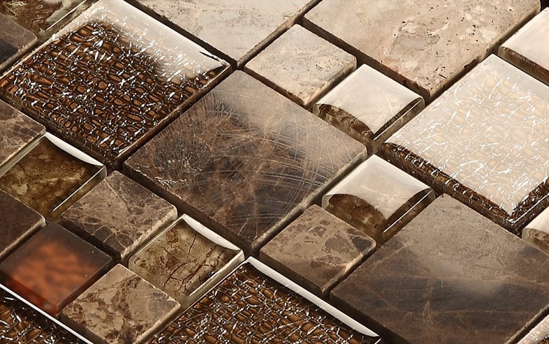 Collection: Stone Mosaic Tiles; Material: Stone and Glass; Color: Brown; Shape: Square; Size: 300mmx300mm; Chip size: 23x48mm, 48mmx 48mm; Thickness: 8mm