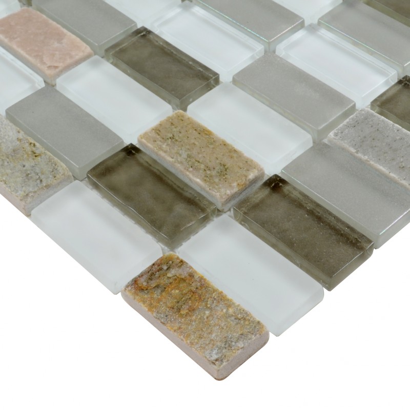 Collection: Stone Mosaic Tiles; Material: Stone and Glass; Color: Grey and White,Brown; Shape: Strip; Size: 300mmx300mm; Chip size: 23x48mm; Thickness: 8mm