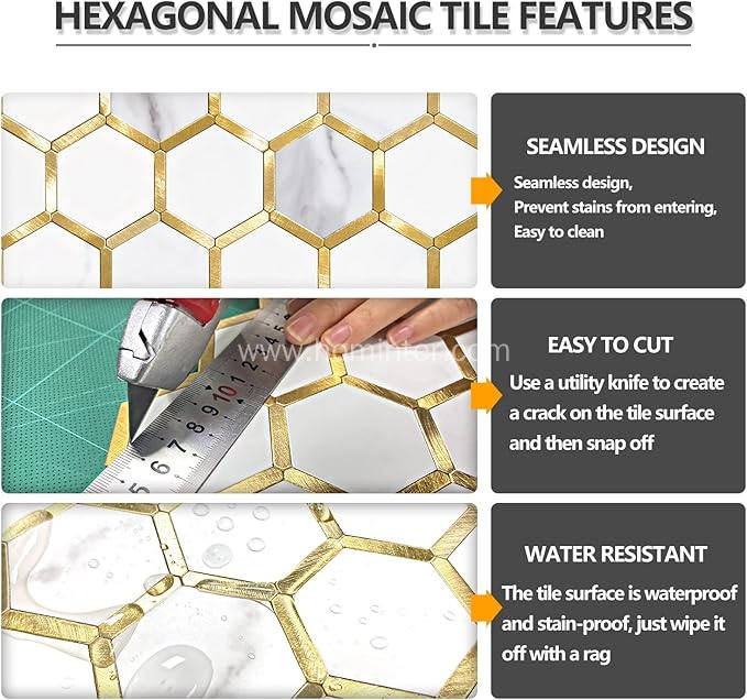 Premium Quality White Peel and Stick Tile Hexagon Gold Border Adhesive Mosaic Wall Tiles. Resistant to humidity and heat. Quick and easy installation: No grout. Easy to clean and maintain. Perfect for accent walls, hallway walls, kitchen and bathroom backsplash, living room, bedroom, office walls decor.